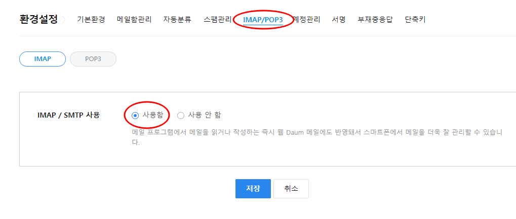 IMAP/SMTP 사용함으로 선택하고 저장을 누르세요.